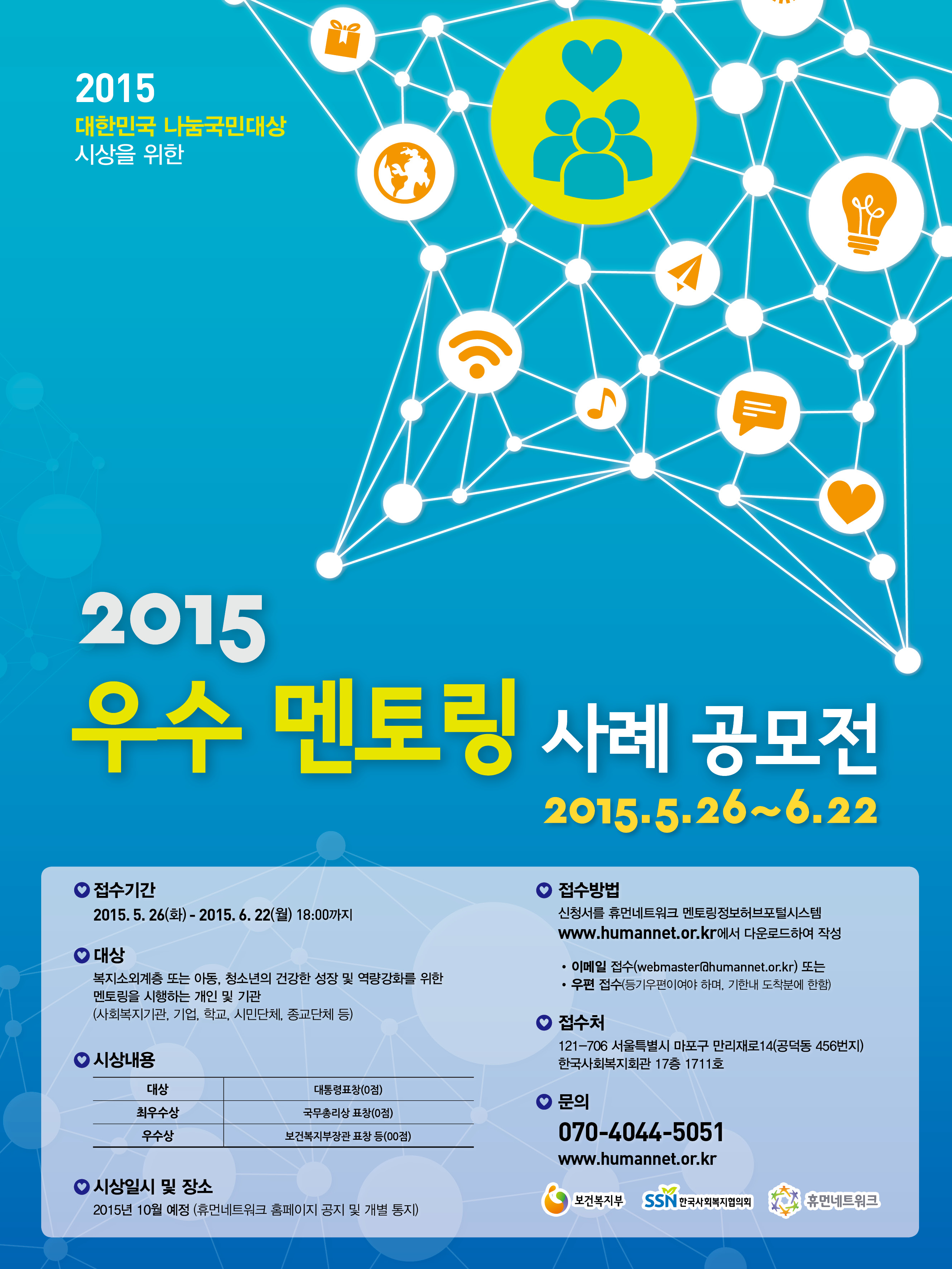 한국사회복지협의회에서는 멘토링 수행기관의 자긍심 고취와 실무자의 사기 진작을 통한 멘토링사업 확산을 위해 2015 대한민국 나눔국민대상 시상을 위한「휴먼네트워크 우수 멘토링 사례 공모전」을 실시하고 있습니다.