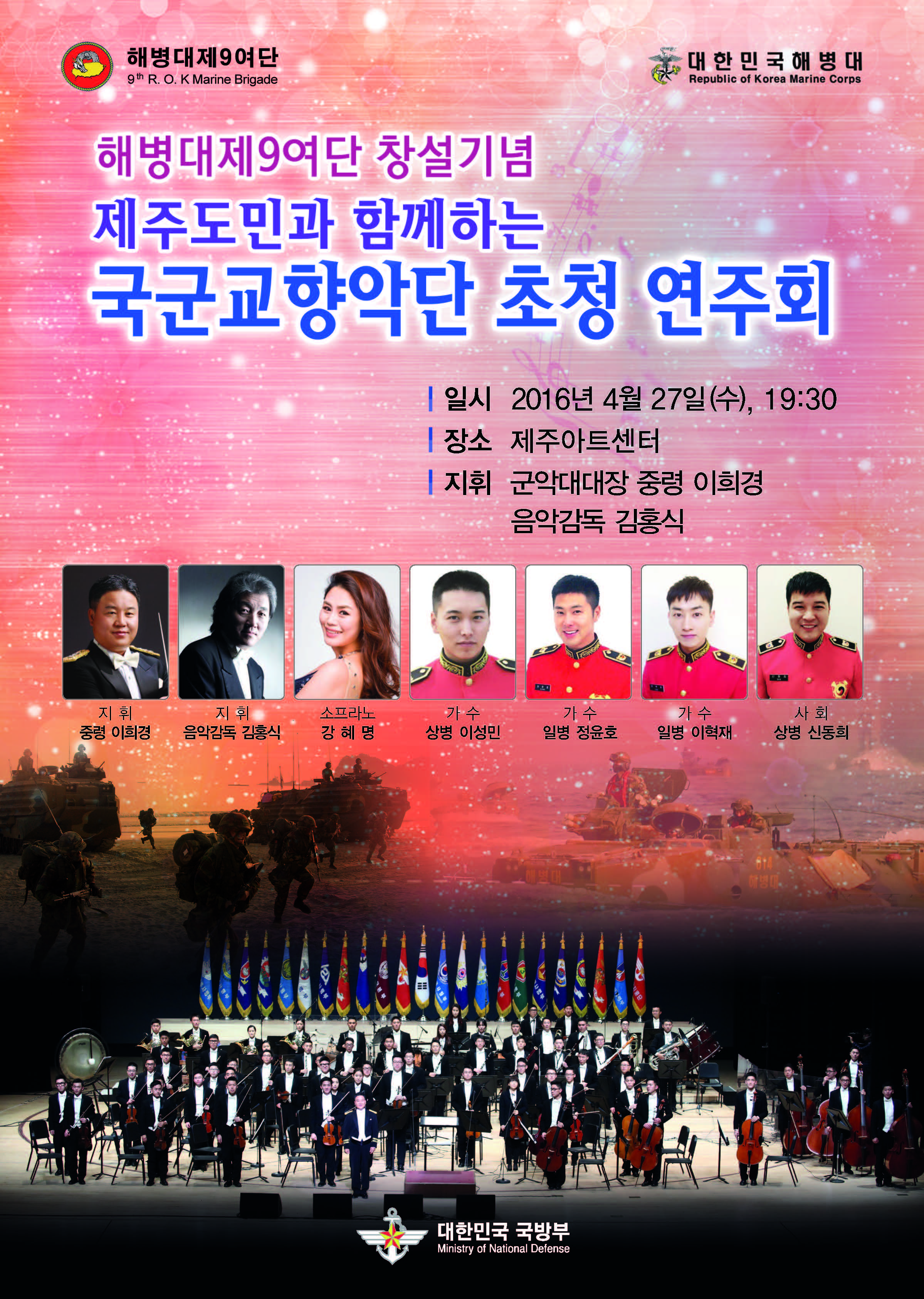 국방부에서는 해병대 제9여단 창설을 기념하여 '제주도민과 함께하는 국군교향악단 초청 연주회'를 개최합니다.