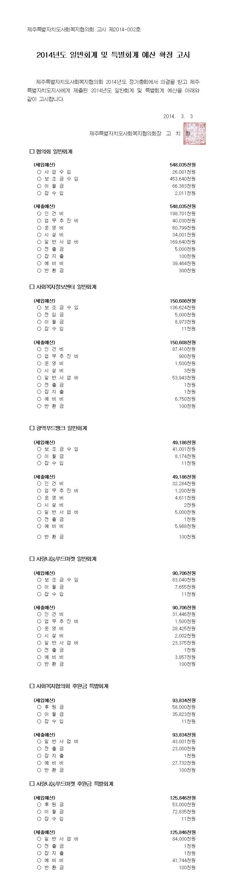 2014년도 일반회계 및 특별회계 예산고시