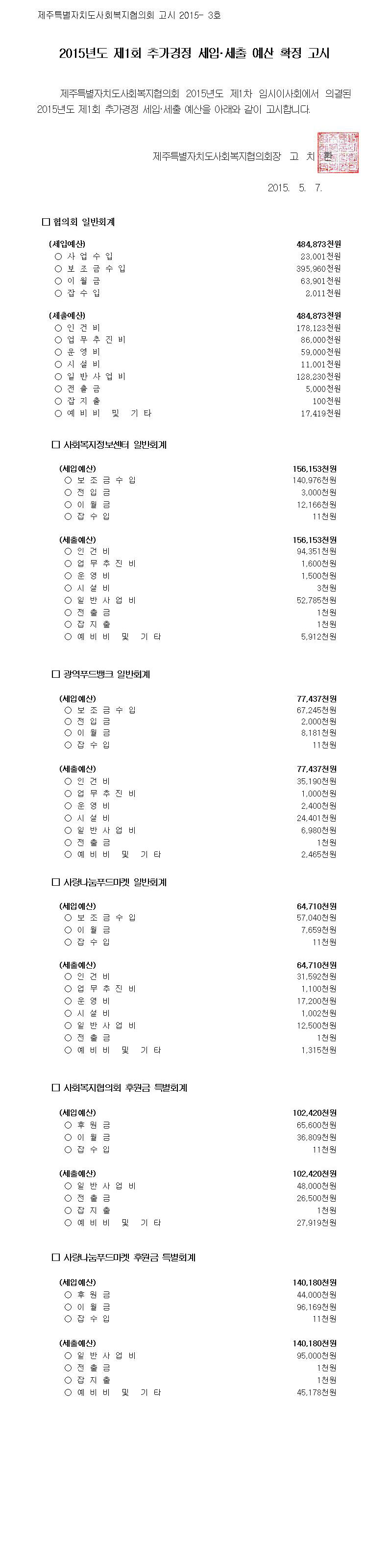 제주특별자치도사회복지협의회 2015년도 제1회 추가경정 세입세출 예산 확정고시