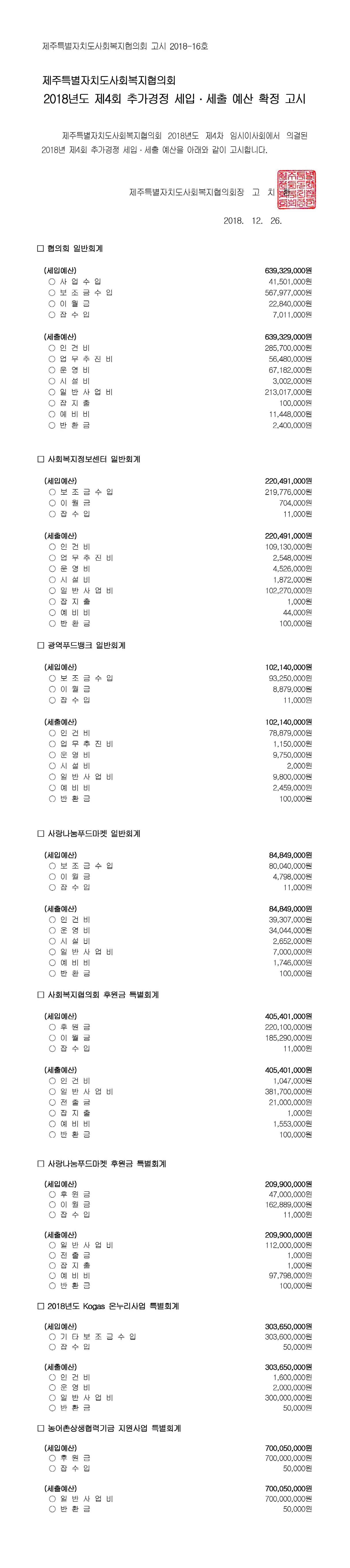 2018년도 제4회 추가경정 세입세출 예산고시