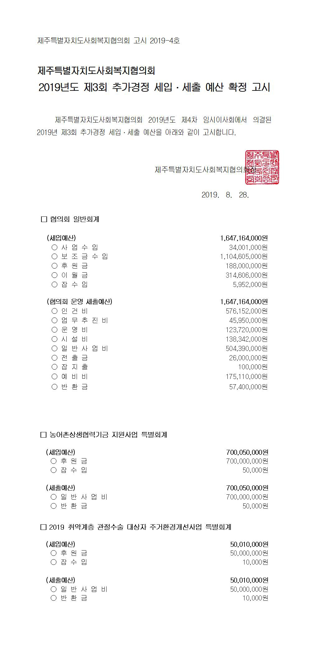 2019년도 제3회 추가경정 세입세출 예산고시