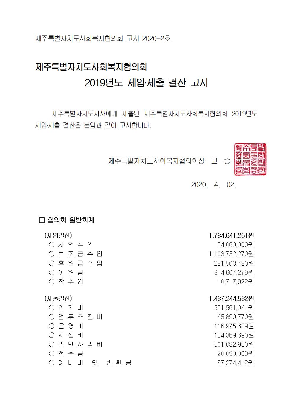 2019년도 세입세출 결산고시