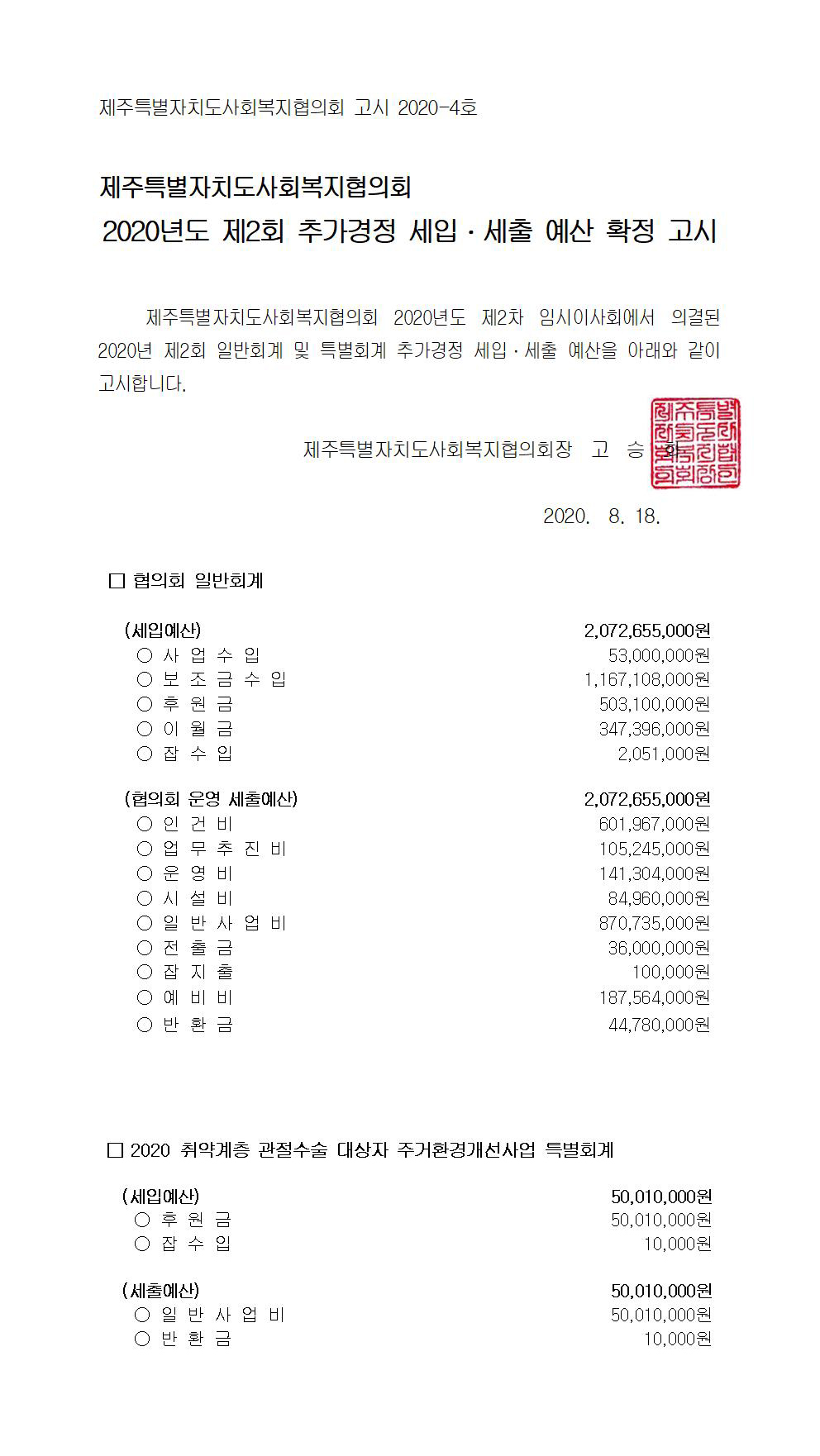 2020년도 제2회 추가경정 세입세출 예산고시