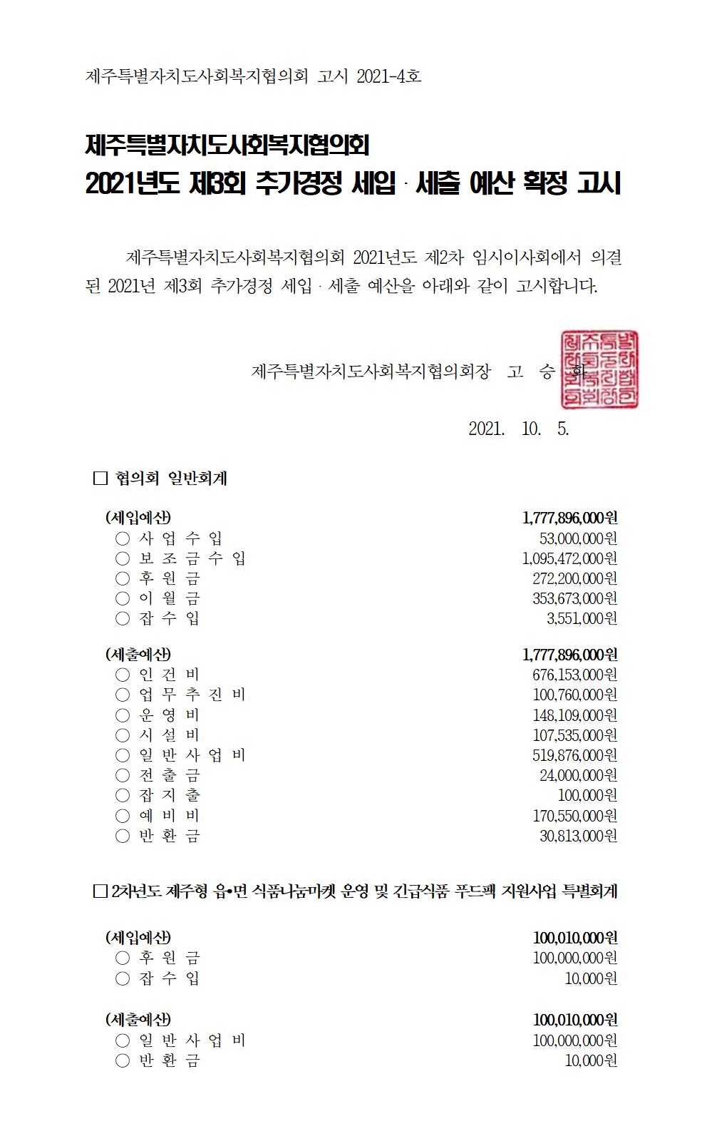 2021년도 제3회 추가경정 세입세출 예산고시