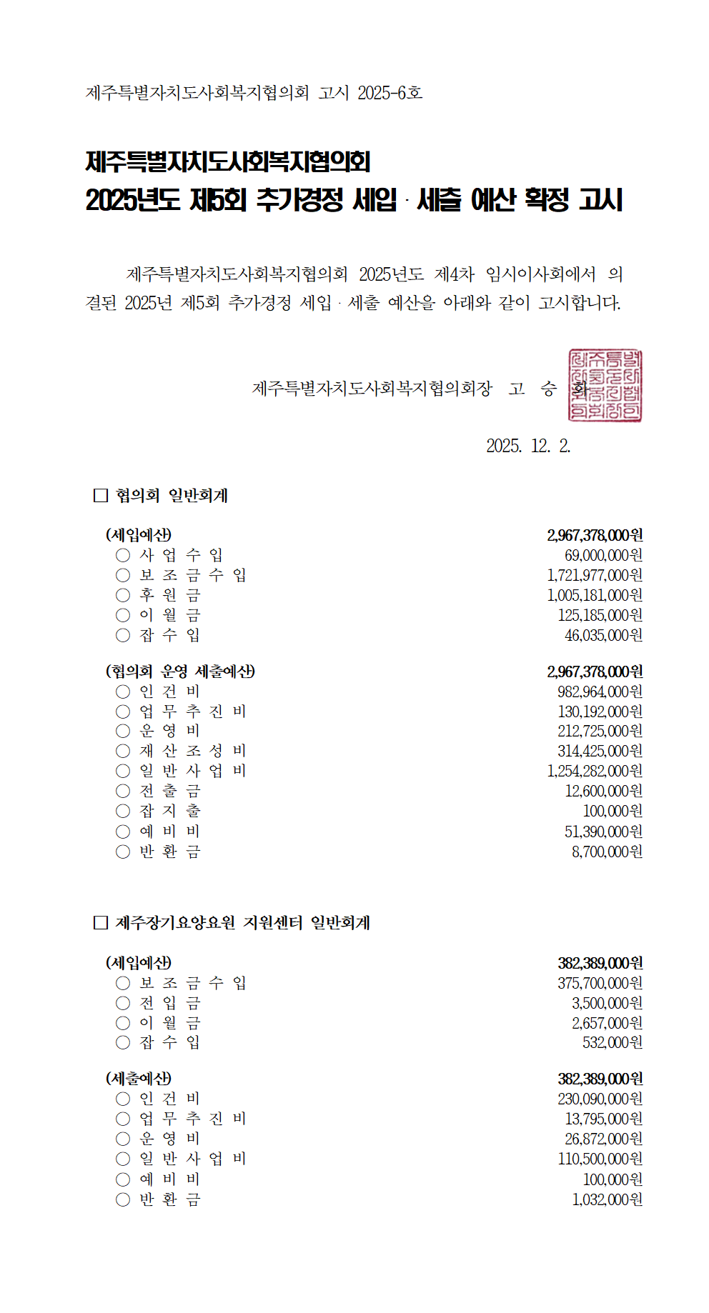 2025년도 제5회 추가경정 세입세출 예산고시