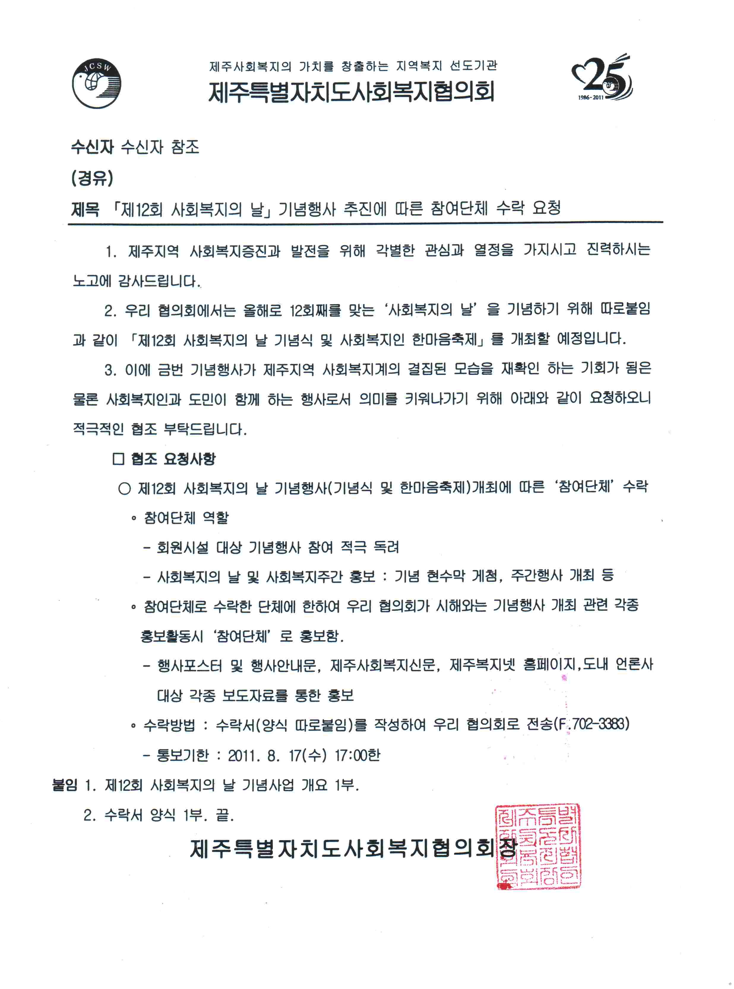 제12회 사회복지의 날 기념행사 추진에 따른 참여단체 수락 요청