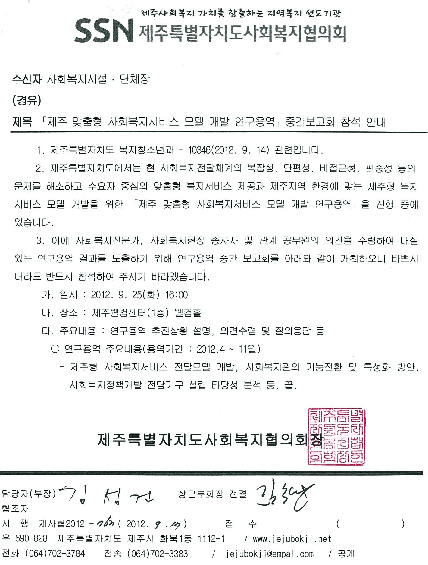 「제주 맞춤형 사회복지서비스 모델 개발 연구용역」중간보고회 참석 안내