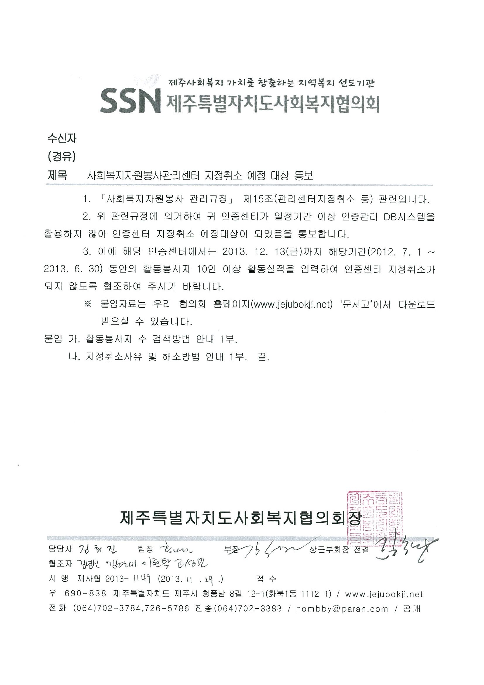 사회복지자원봉사관리센터 지정취소 예정 대상 통보