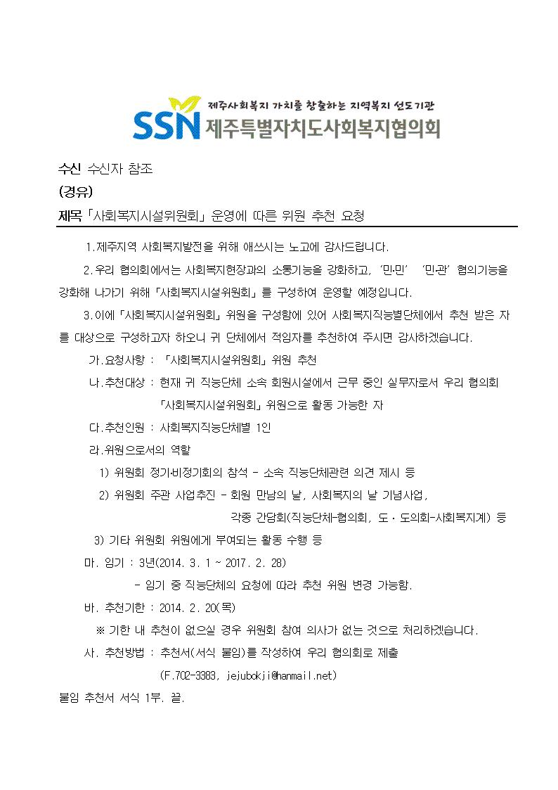 「사회복지시설위원회」운영에 따른 위원 추천 요청