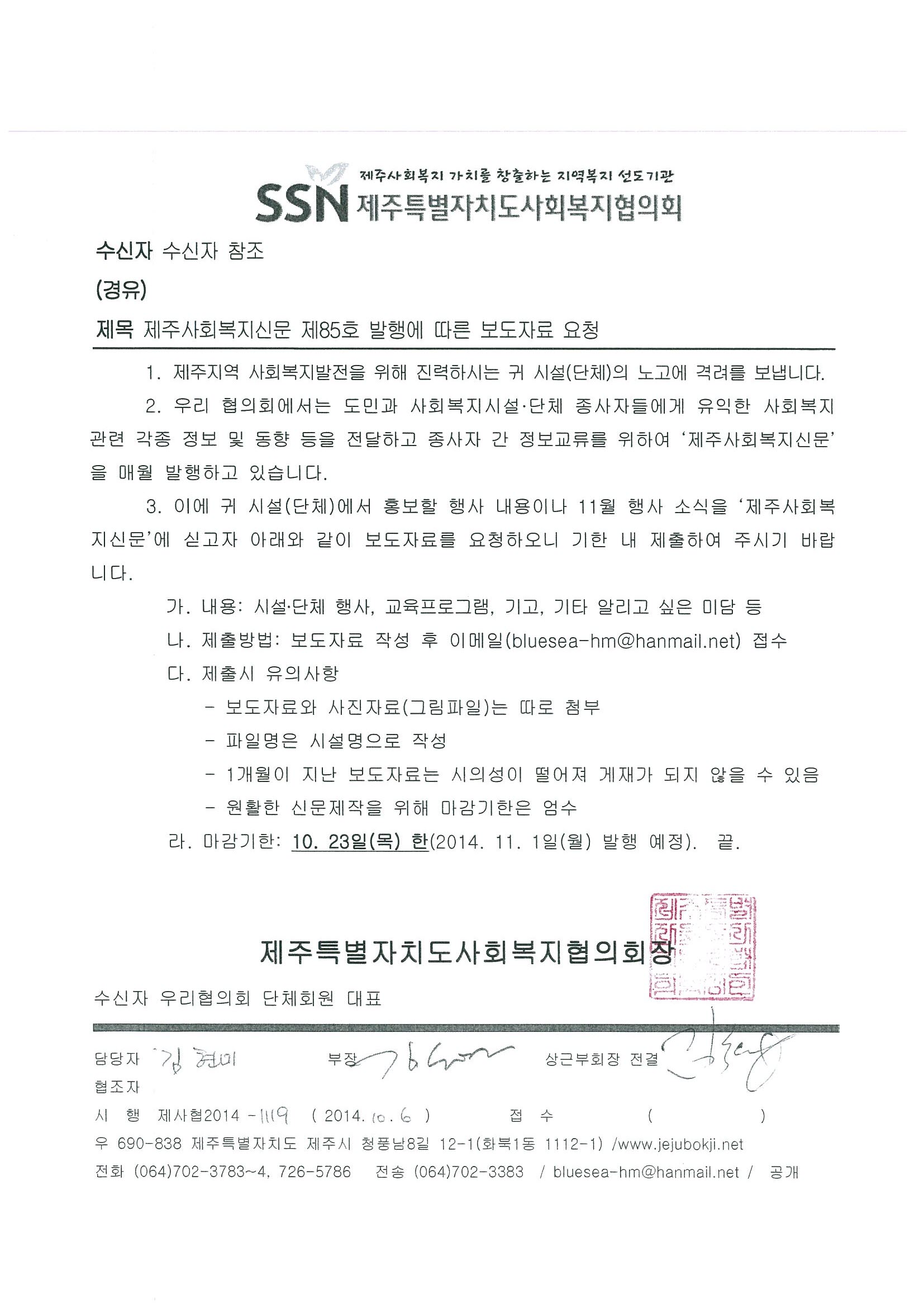 제주사회복지신문 85호 발행에 따른 보도자료 요청 공문