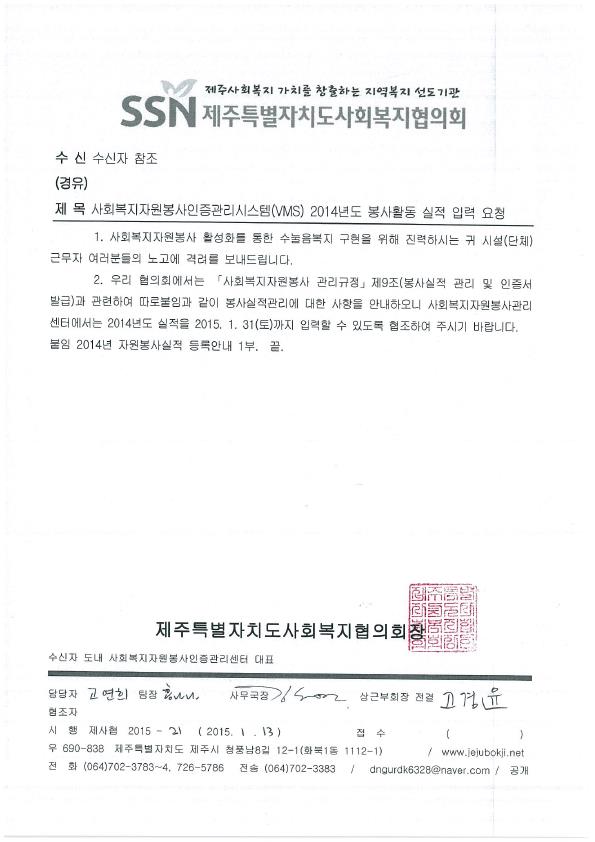 사회복지자원봉사인증관리시스템(VMS) 2014년도 봉사활동 실적 입력 요청