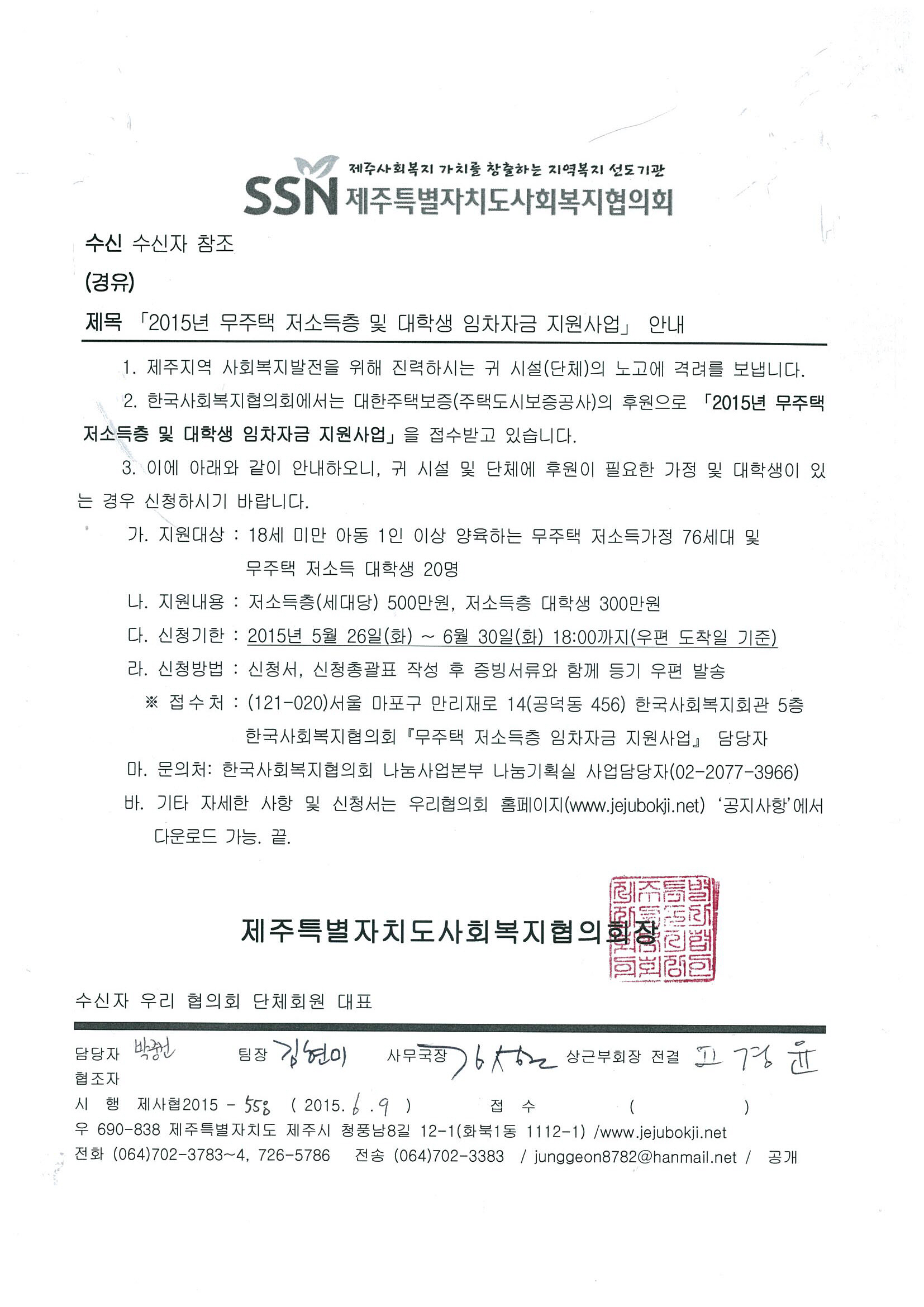 「2015년 무주택 저소득층 및 대학생 임차자금 지원사업」 안내