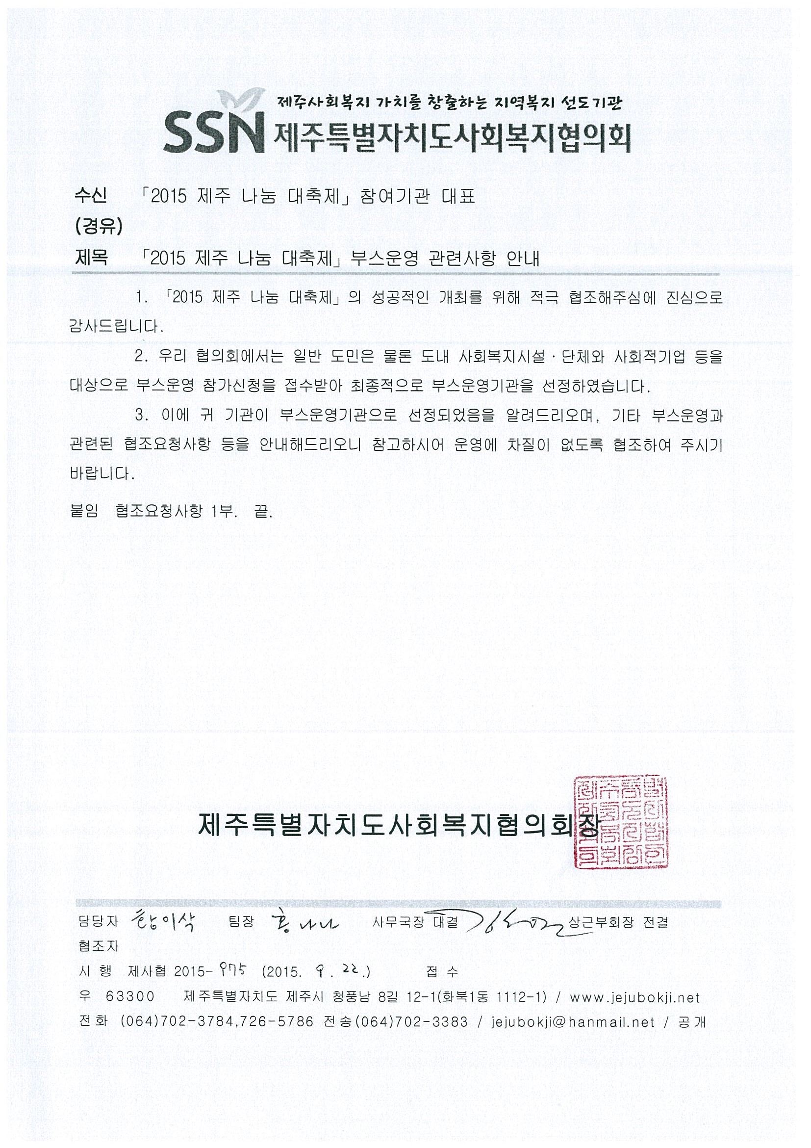 「2015 제주 나눔 대축제」부스운영 관련사항 안내