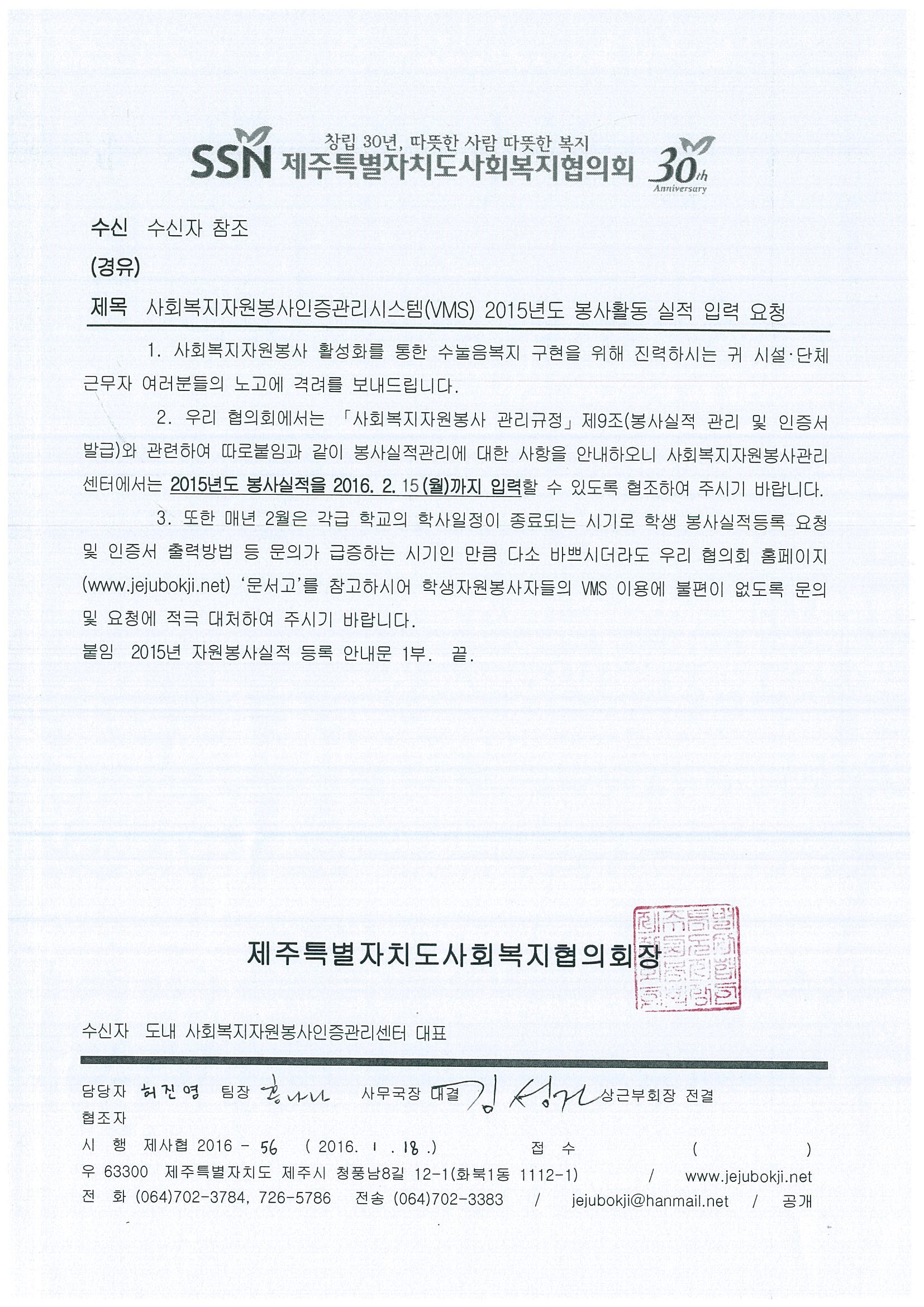 사회복지자원봉사인증관리시스템(VMS) 2015년도 봉사활동 실적 입력 요청