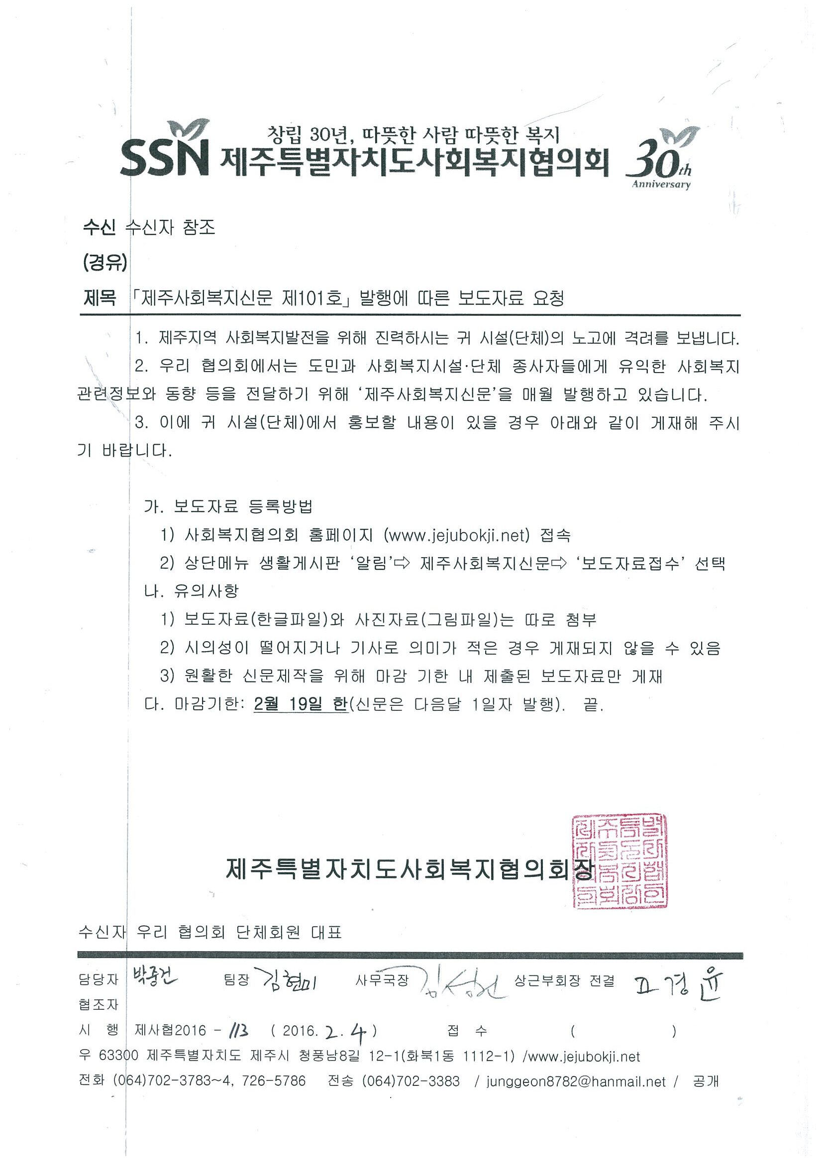 제주사회복지신문 101호 보도자료 요청공문