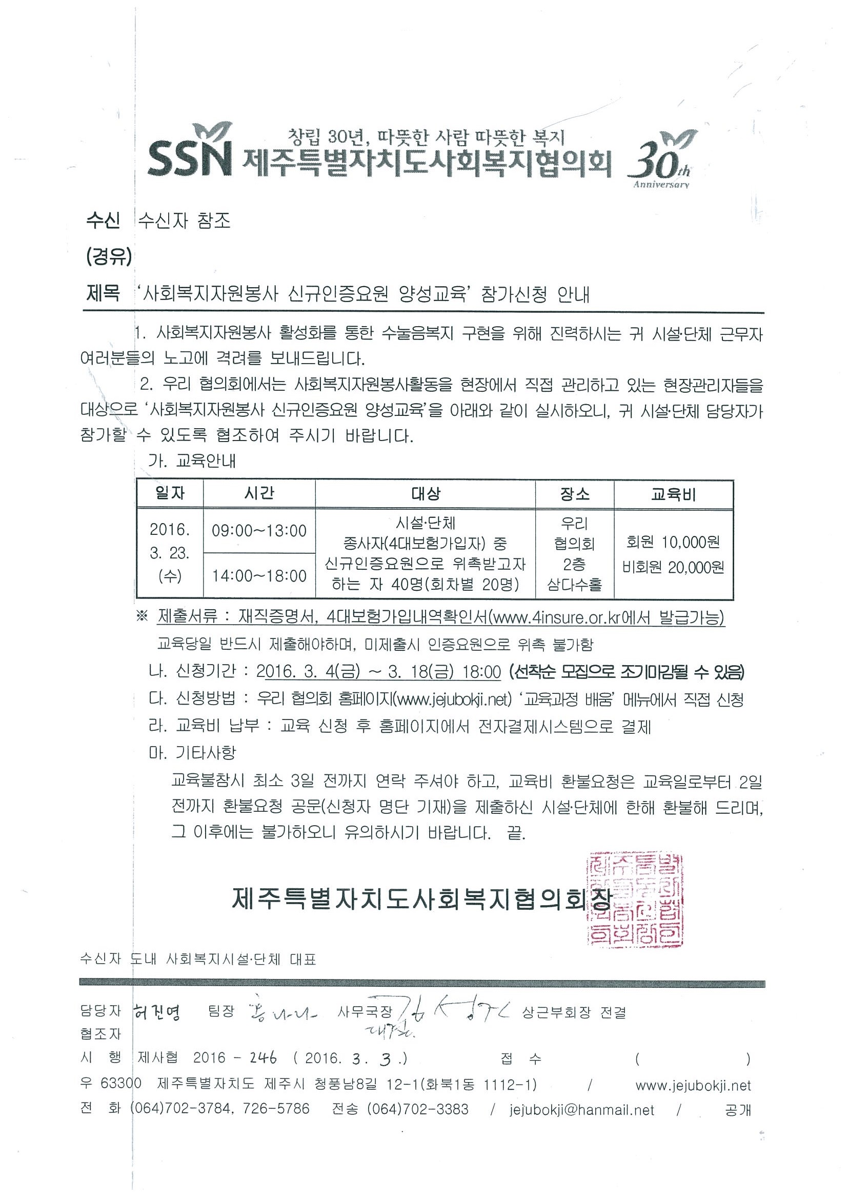 2016년도 1분기 사회복지자원봉사 신규인증요원 양성교육 안내