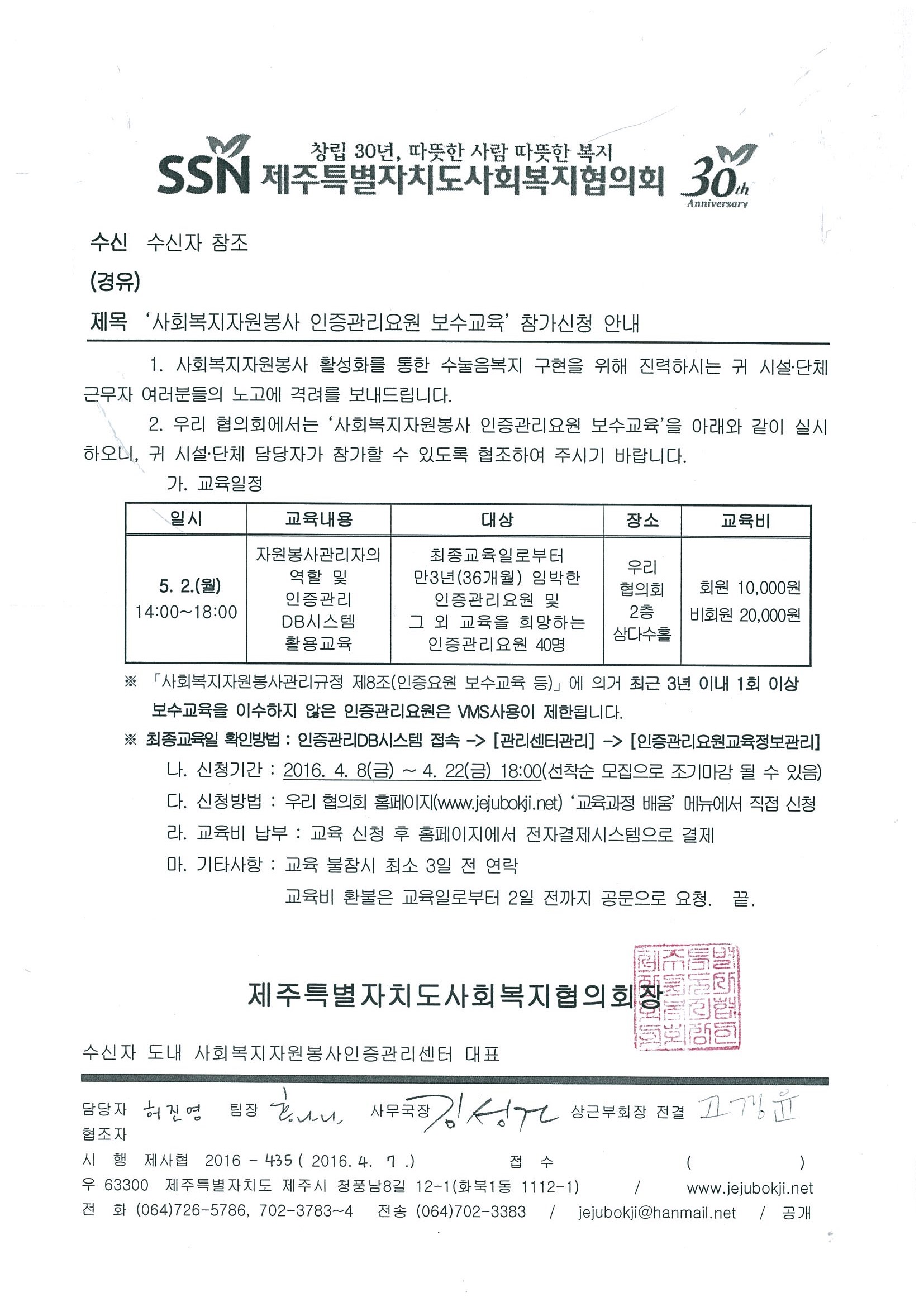2016년도 사회복지자원봉사 인증관리요원 보수교육(상반기) 참가신청 안내