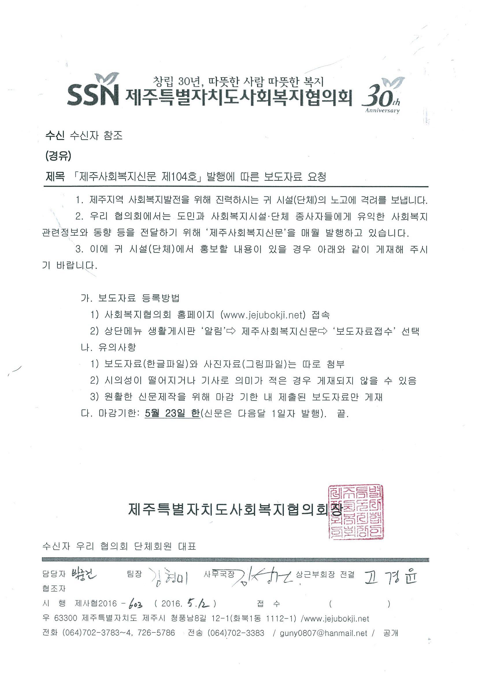 제주사회복지신문 104호 보도자료 요청공문