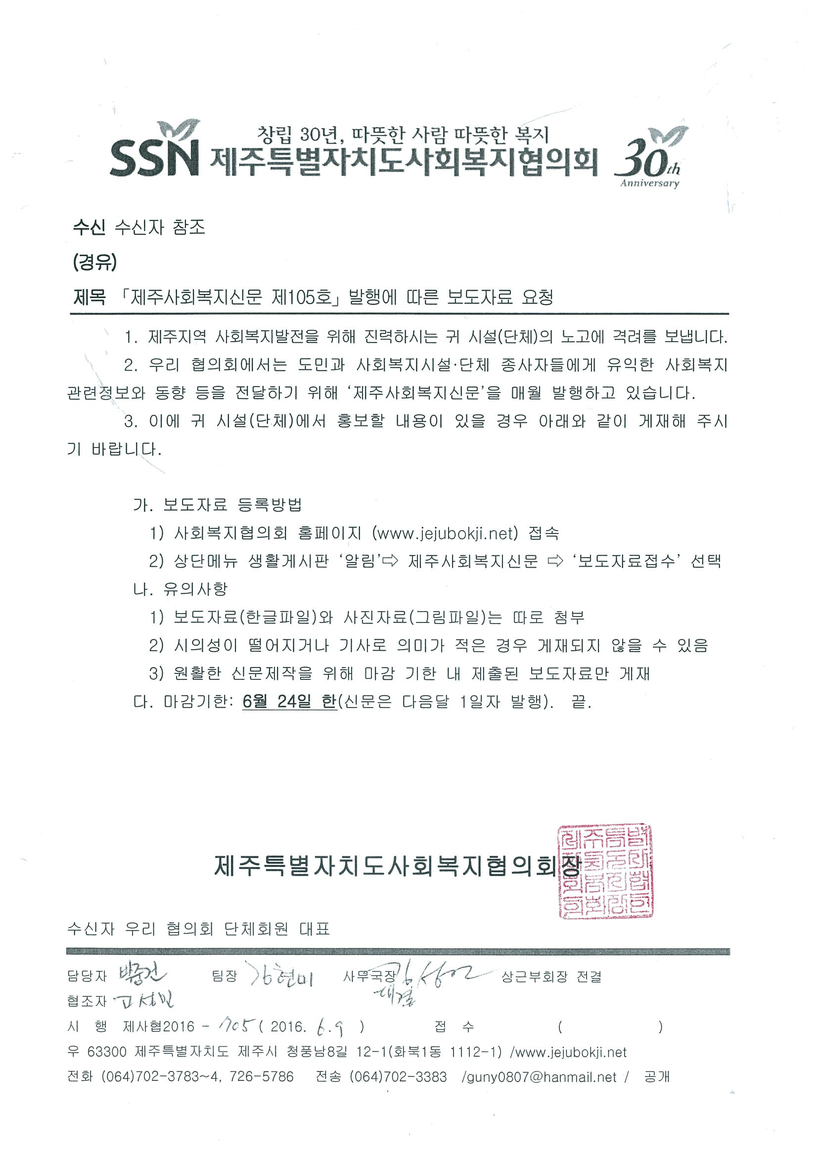 제주사회복지신문 105호 보도자료 요청공문