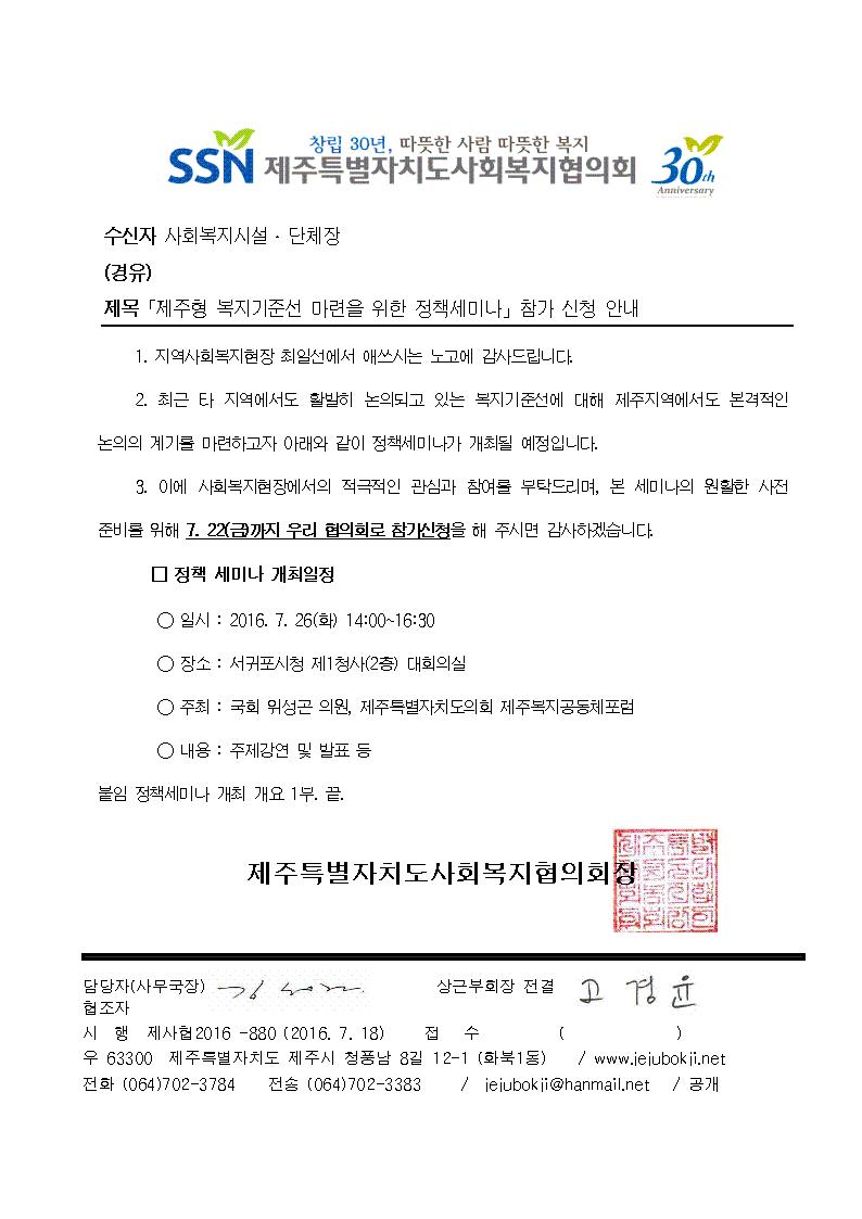 '제주형 복지기준선 마련을 위한 정책 세미나' 참가신청 안내