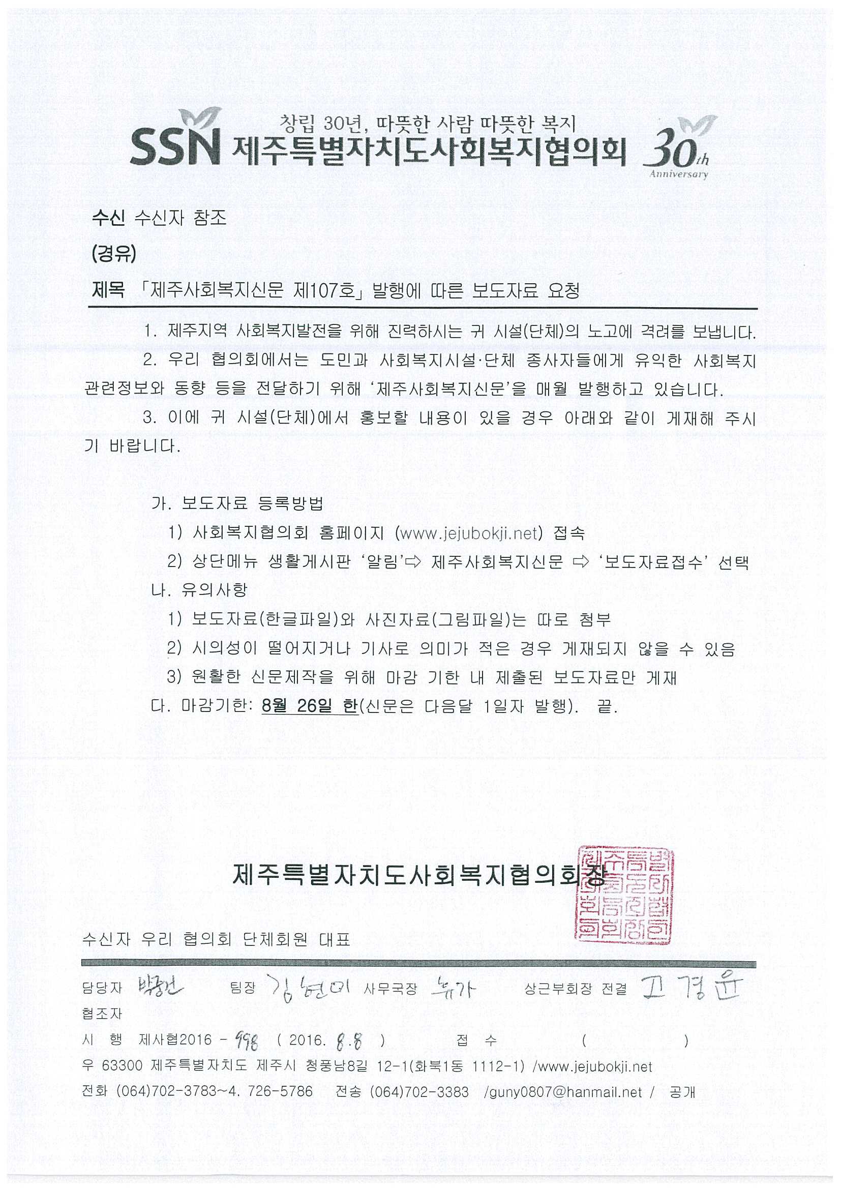 제주사회복지신문 107호 발행에 따른 보도자료 등록 안내 공문