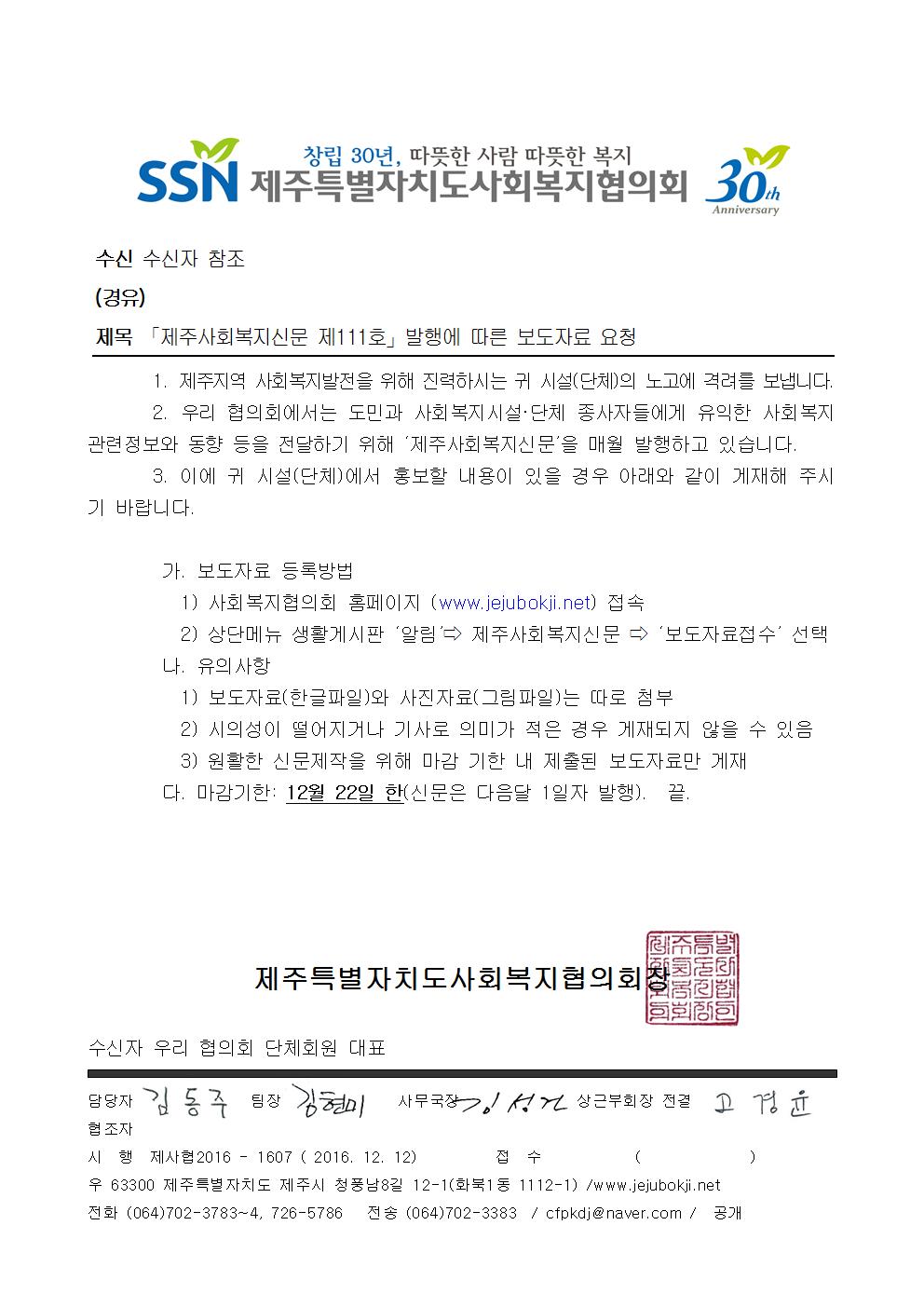 제주사회복지신문 111호 발행에 따른 보도자료 등록 안내 공문