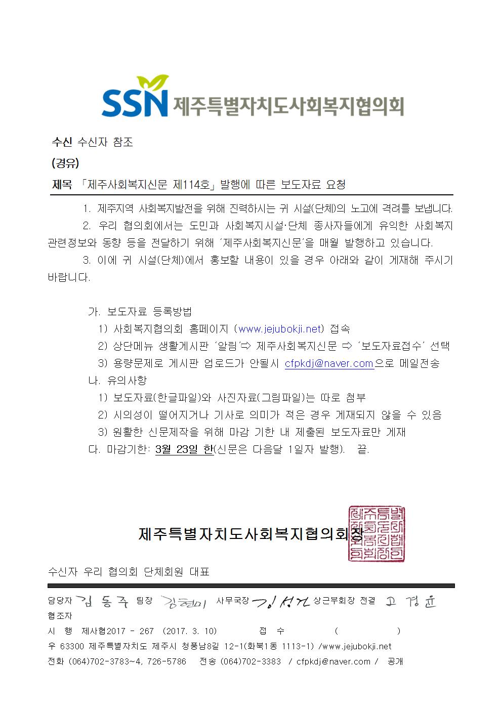 「제주사회복지신문 제114호」발행에 따른 보도자료 요청