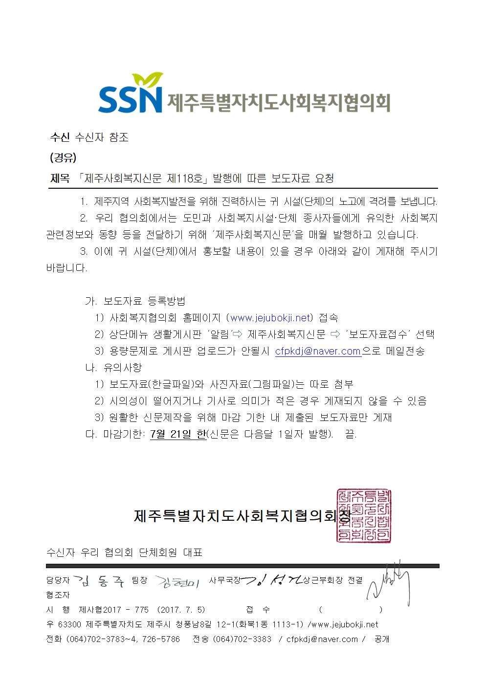 「제주사회복지신문 제118호」발행에 따른 보도자료 요청