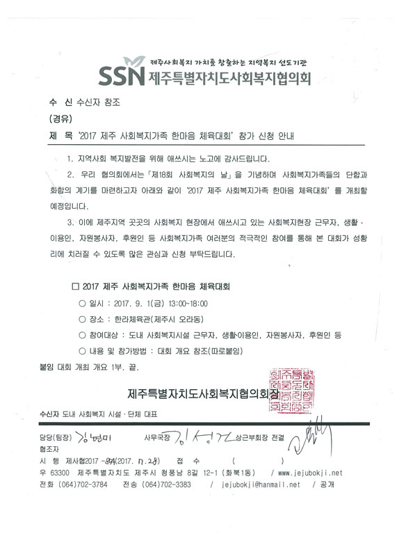 2017 제주 사회복지가족 한마음 체육대회’참가 신청 안내