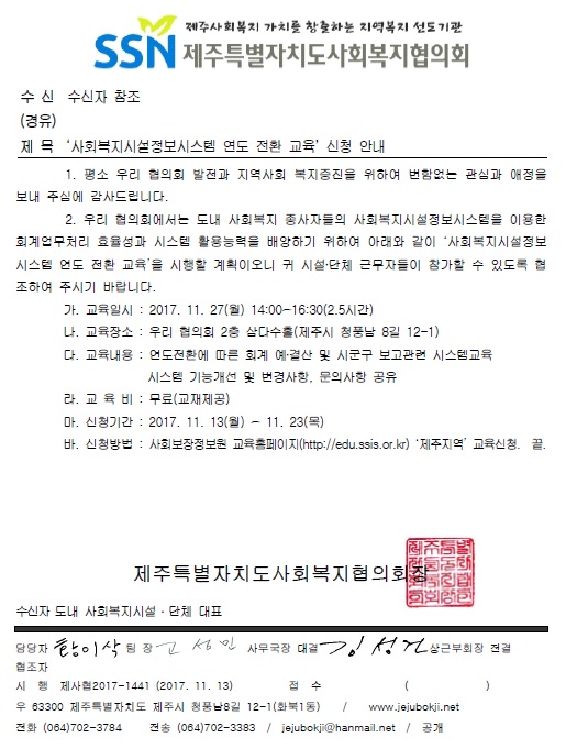 '2017년도 사회복지시설정보시스템 연도 전환 교육' 신청 안내