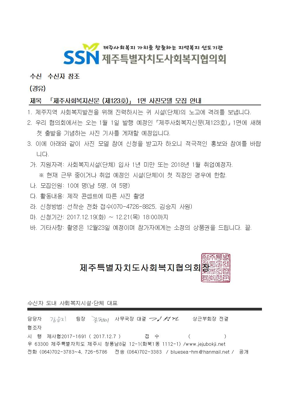 「제주사회복지신문 (제123호)」 1면 사진모델 모집 안내