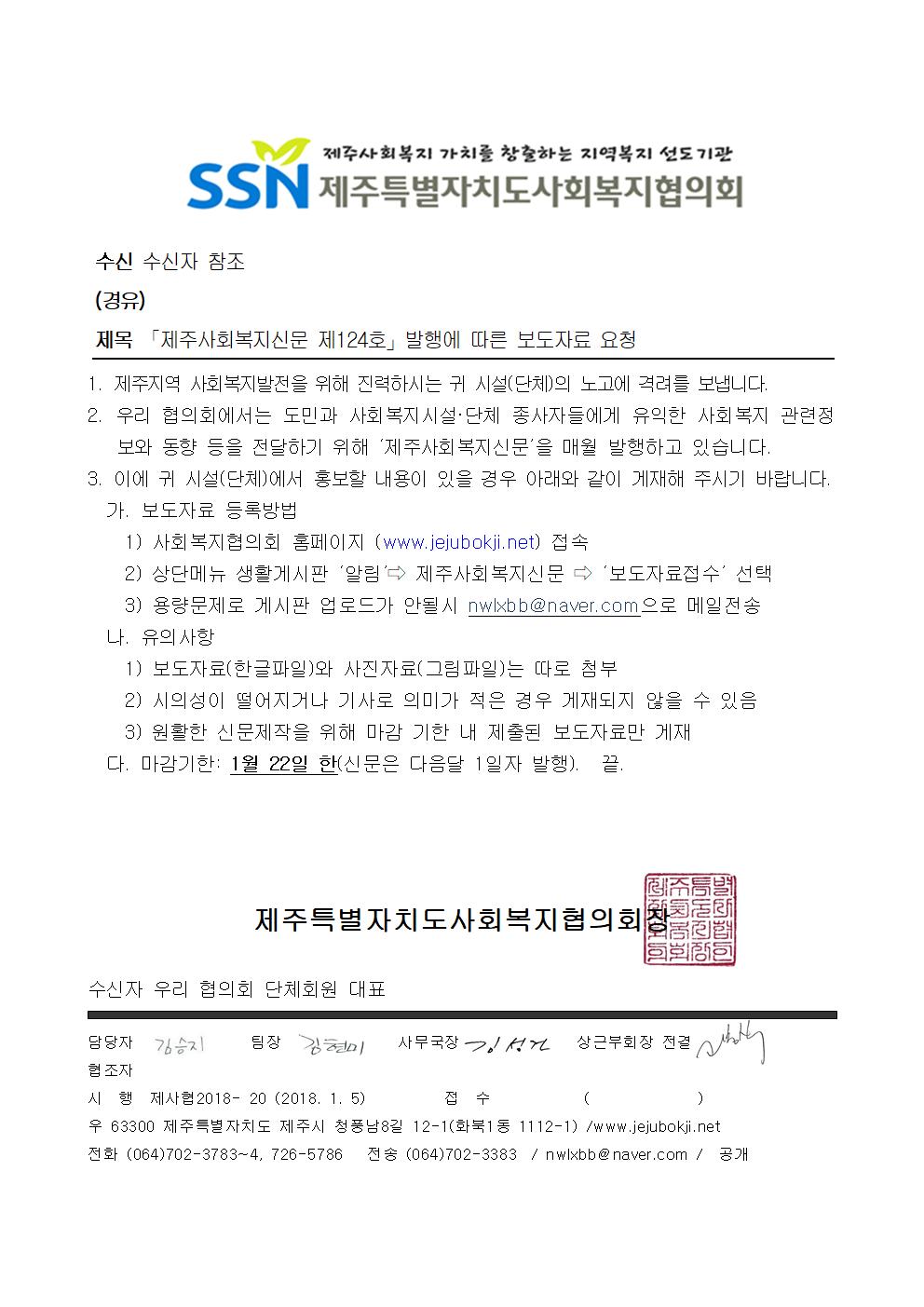 「제주사회복지신문 제124호」발행에 따른 보도자료 요청