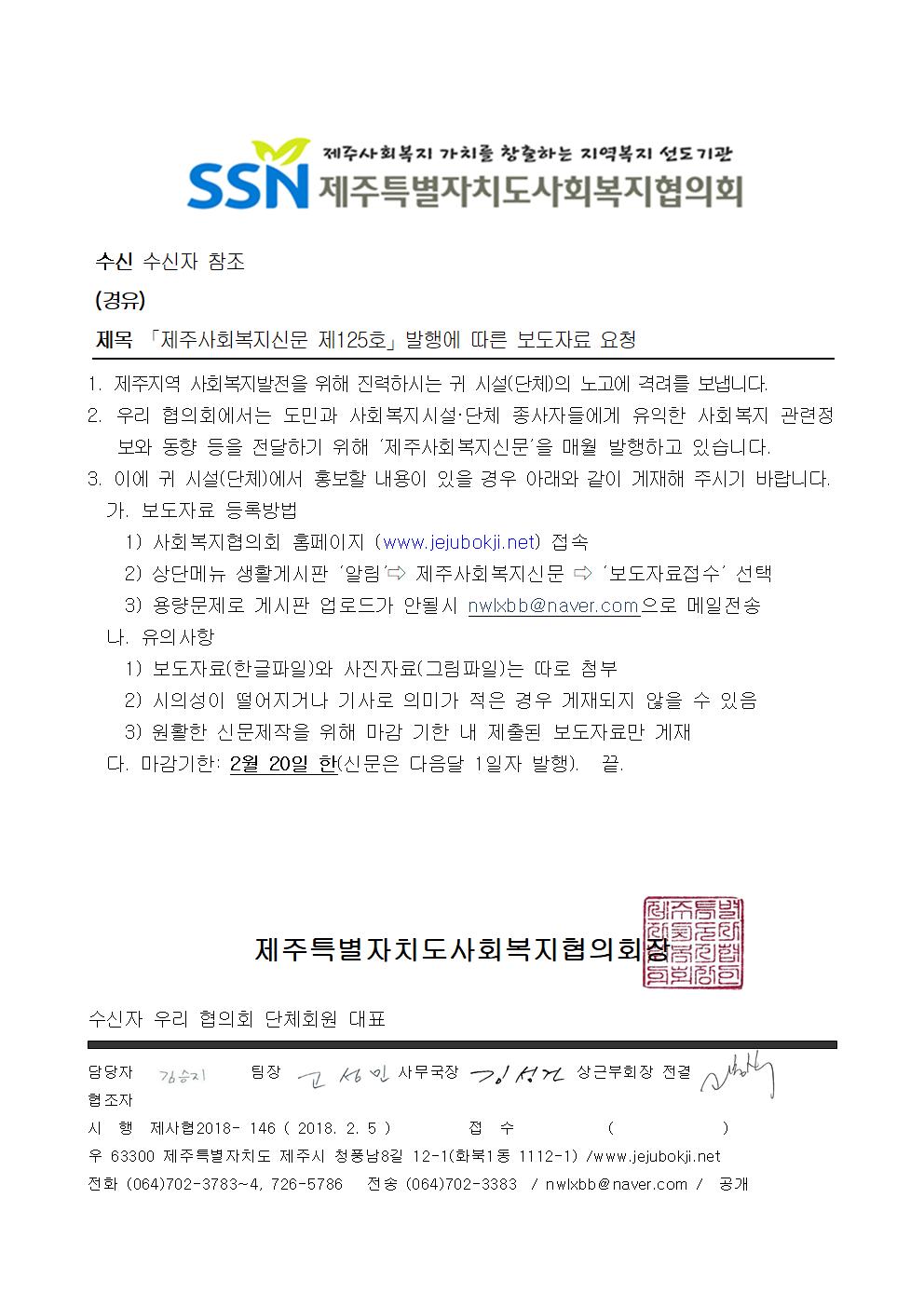 「제주사회복지신문 제125호」발행에 따른 보도자료 요청