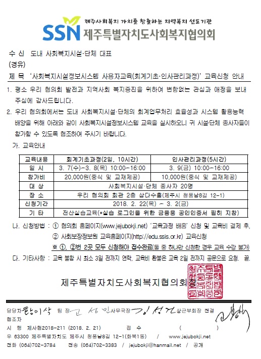 1분기 사회복지시설정보시스템 교육 안내(회계기초·인사관리과정)