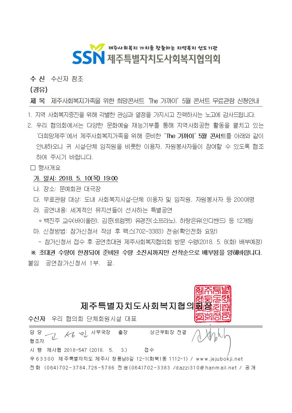 제주사회복지가족을 위한 희망콘서트‘The 가까이’5월 콘서트 무료관람 신청안내
