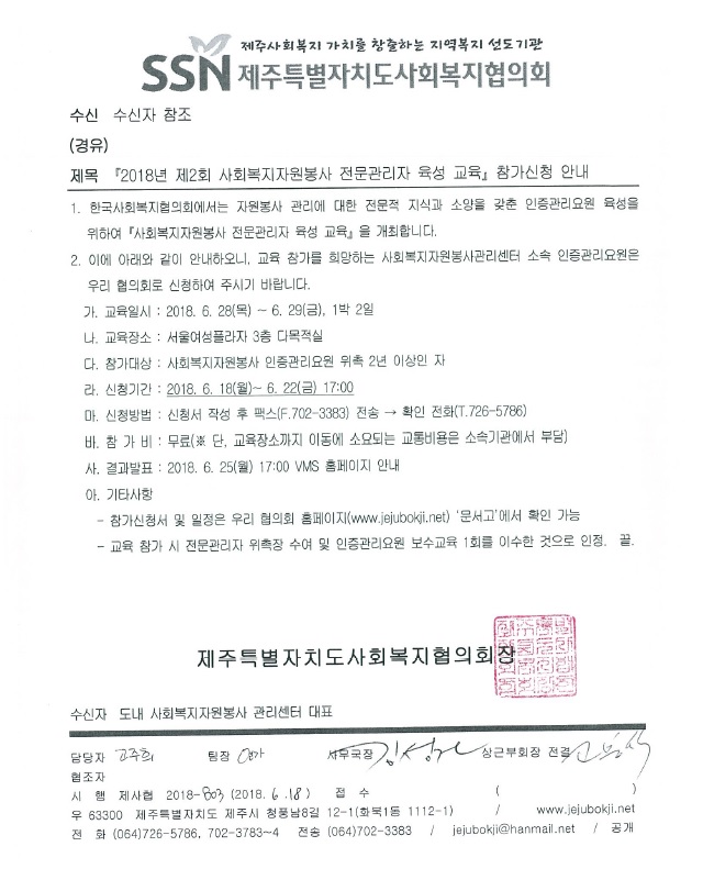 2018년 제2회 사회복지자원봉사 전문관리자 육성 교육 참가신청 안내