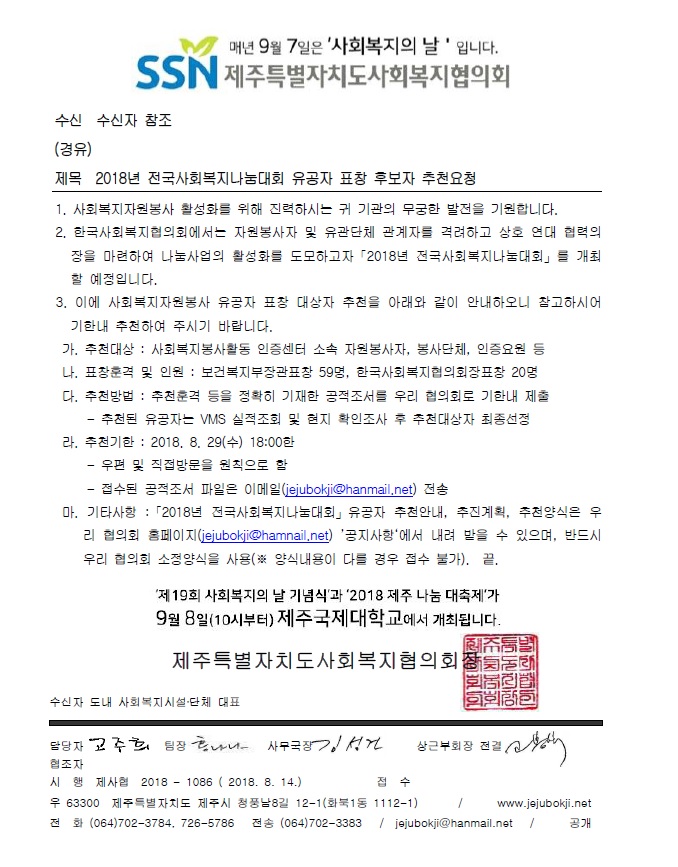 2018년 전국사회복지나눔대회 유공자 표창 후보자 추천요청