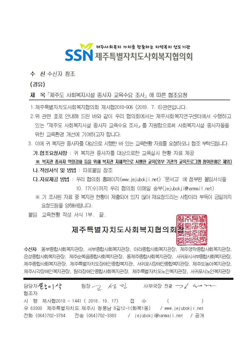 「제주도 사회복지시설 종사자 교육수요 조사」에 따른 협조요청(복지관 대상)