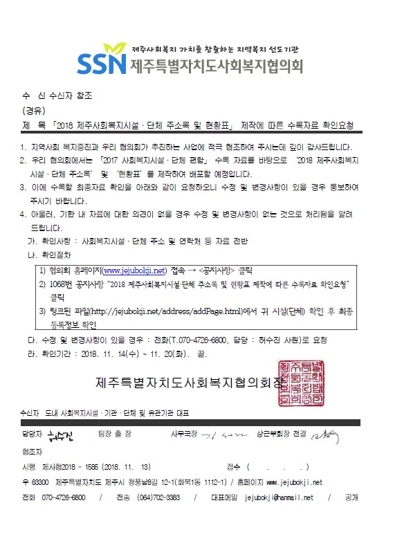 2018 제주사회복지시설·단체 주소록 및 현황표 제작에 따른 수록자료 확인요청