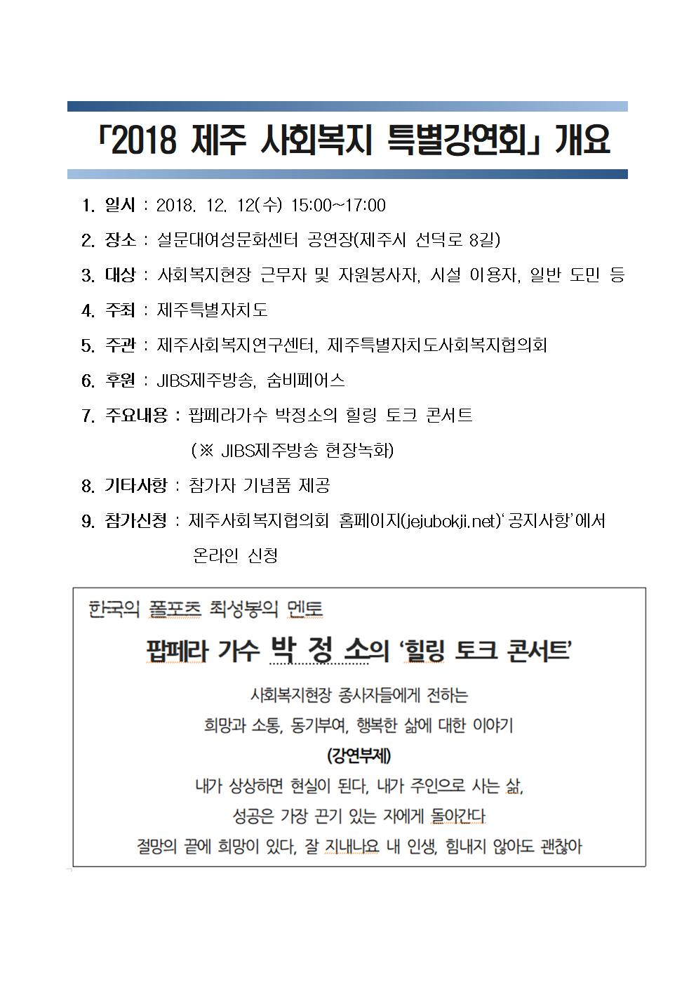 「2018 제주 사회복지 특별강연회 - 팝페라 가수 박정소의 힐링 토크 콘서트」참가안내