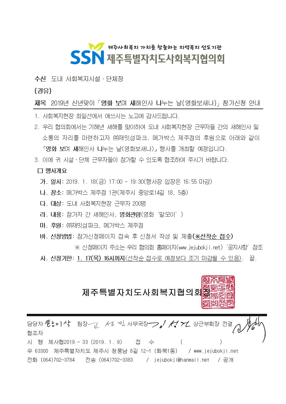 2019년 신년맞이「영화 보고 새해인사 나누는 날(영화보새나)」참가신청 안내