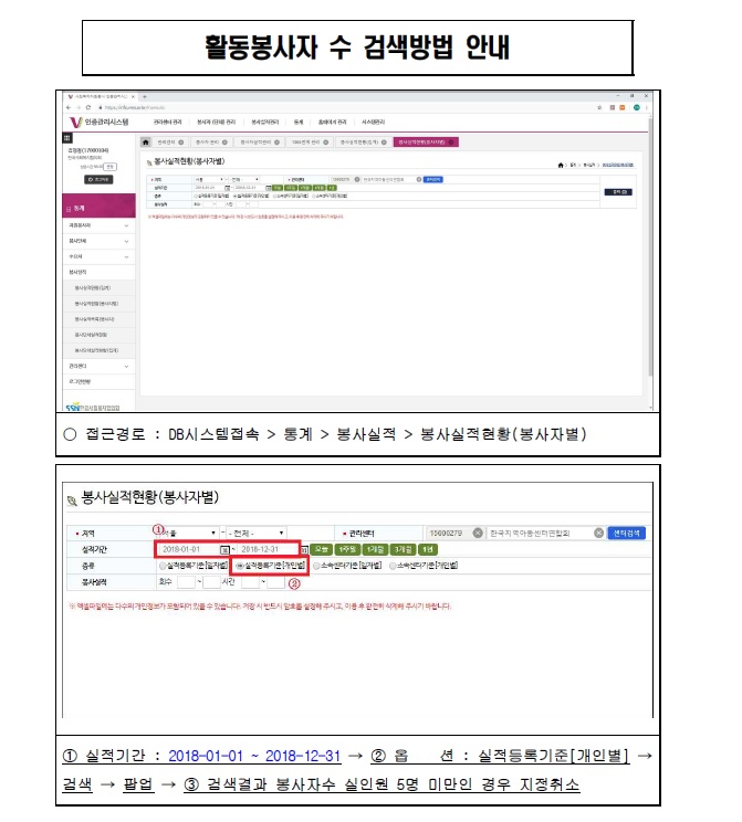 사회복지자원봉사관리센터 지정취소 관련-활동봉사자 수 검색방법 안내