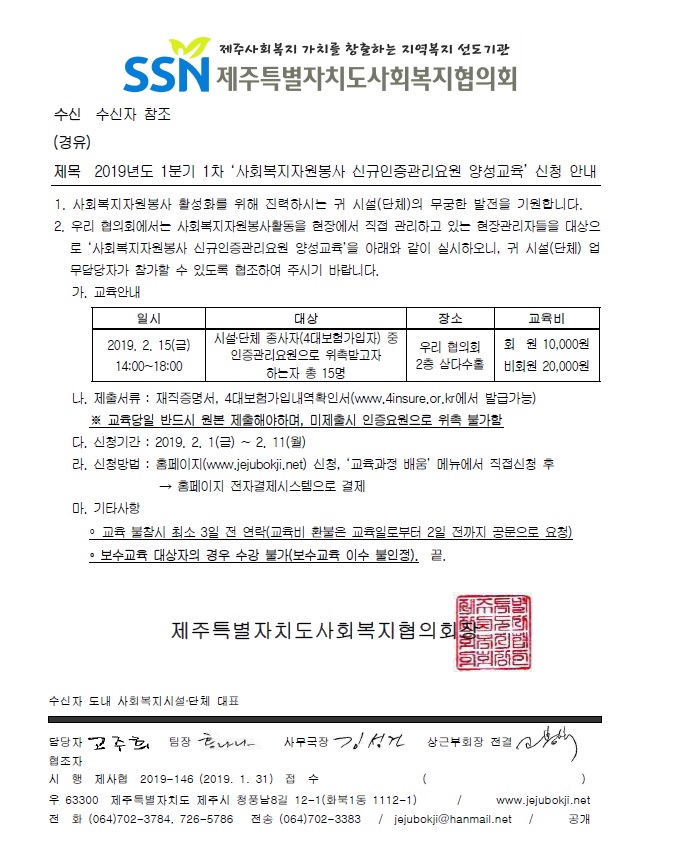 2019년도 1분기 1차 '사회복지자원봉사 신규인증관리요원 양성교육' 신청 안내