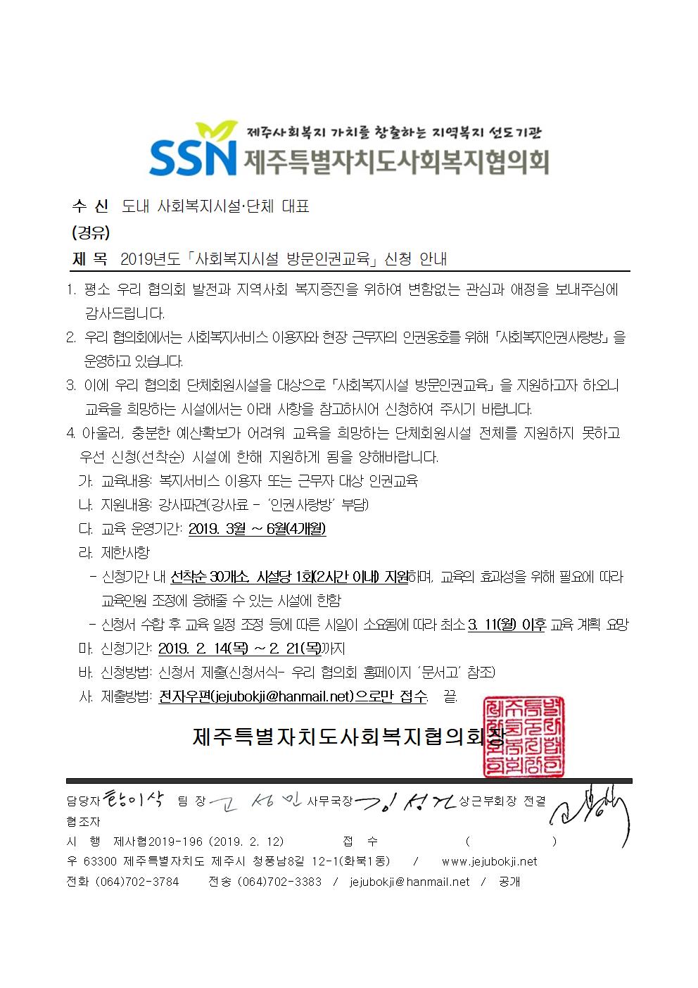 (접수마감)2019년도「사회복지시설 방문인권교육」신청 안내