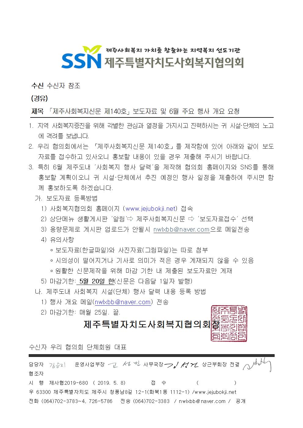 제주사회복지신문 제140호 보도자료 및 6월 주요 행사 개요 요청