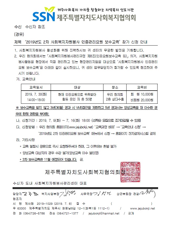 2019년도 2차 사회복지자원봉사 인증관리요원 보수교육 참가 신청 안내