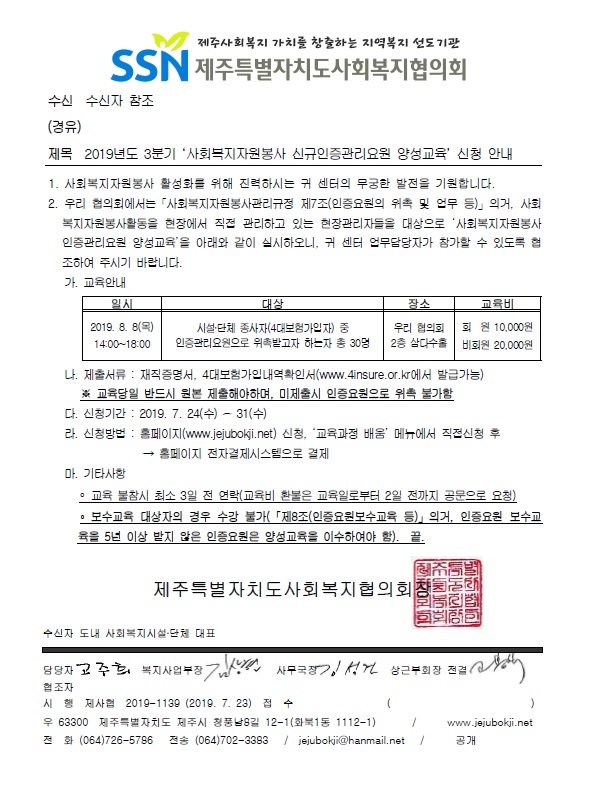 2019년도 3분기 사회복지자원봉사 신규인증요원 양성교육 신청 안내