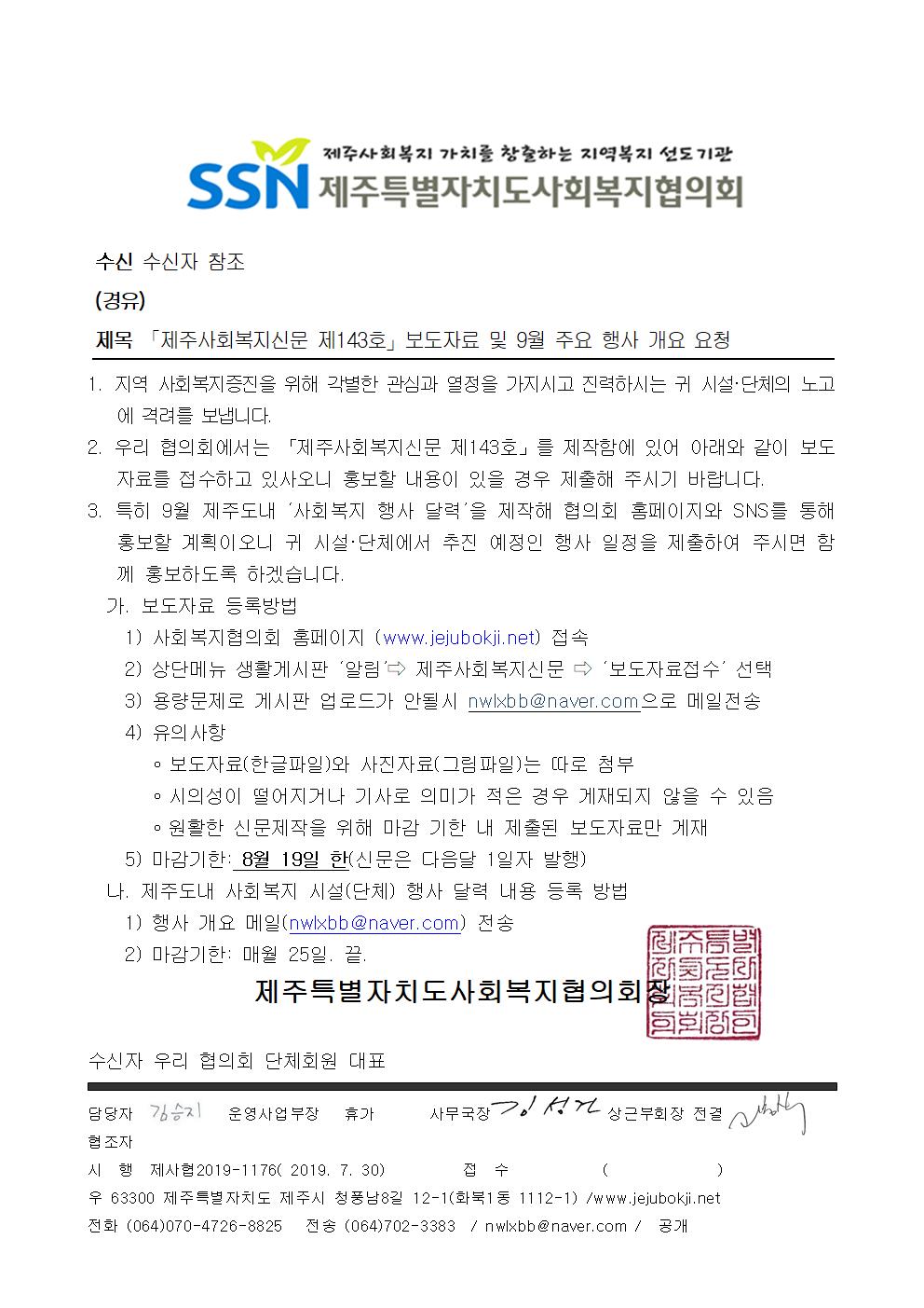 제주사회복지신문 제143호 보도자료 및 9월 주요 행사 개요 요청