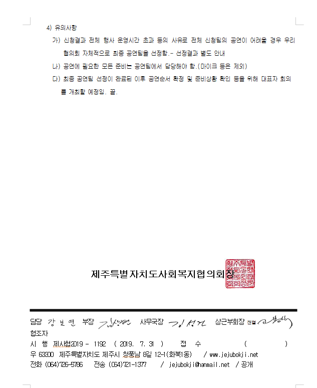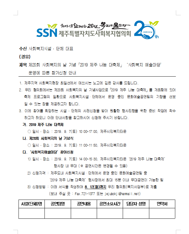 제20회 사회복지의 날 기념 "2019 제주 나눔 대축제" 사회복지 예술마당 운영에 따른 참가신청 안내